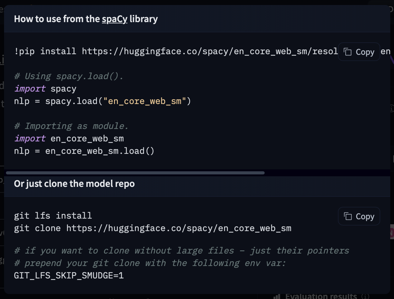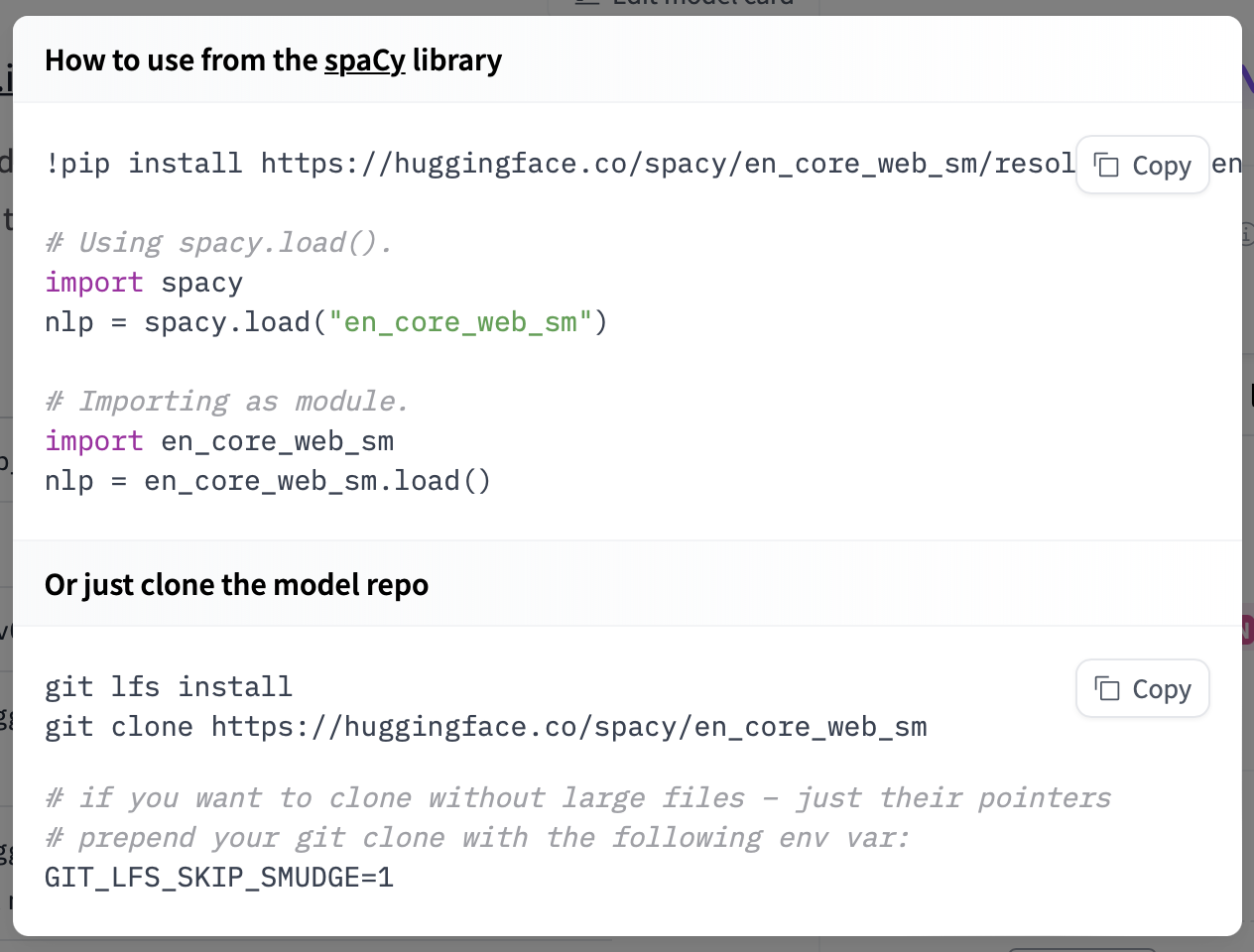 pip install "en_core_web_sm @ https://huggingface.co/spacy/en_core_web_sm/resolve/main/en_core_web_sm-any-py3-none-any.whl"To find the link of interest, you can go to a repository with a spaCy model. When you open the repository, you can click Use in spaCy and you will be given a working snippet that you can use to install and load the model!