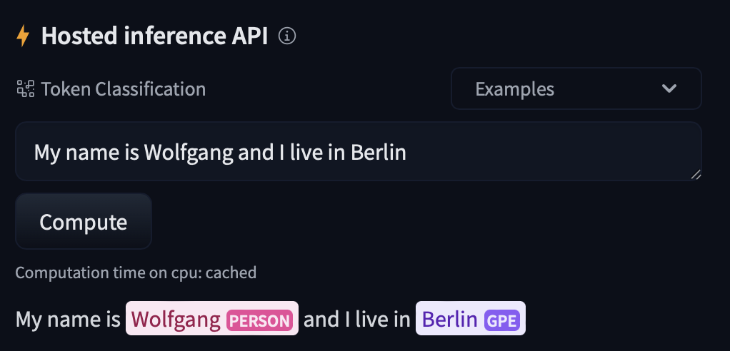 python -m spacy huggingface-hub push en_ner_fashion-0.0.0-py3-none-any.whlIn just a minute, you can get your packaged model in the Hub, try it out directly in the browser, and share it with the rest of the community. All the required metadata will be uploaded for you and you even get a cool model card.