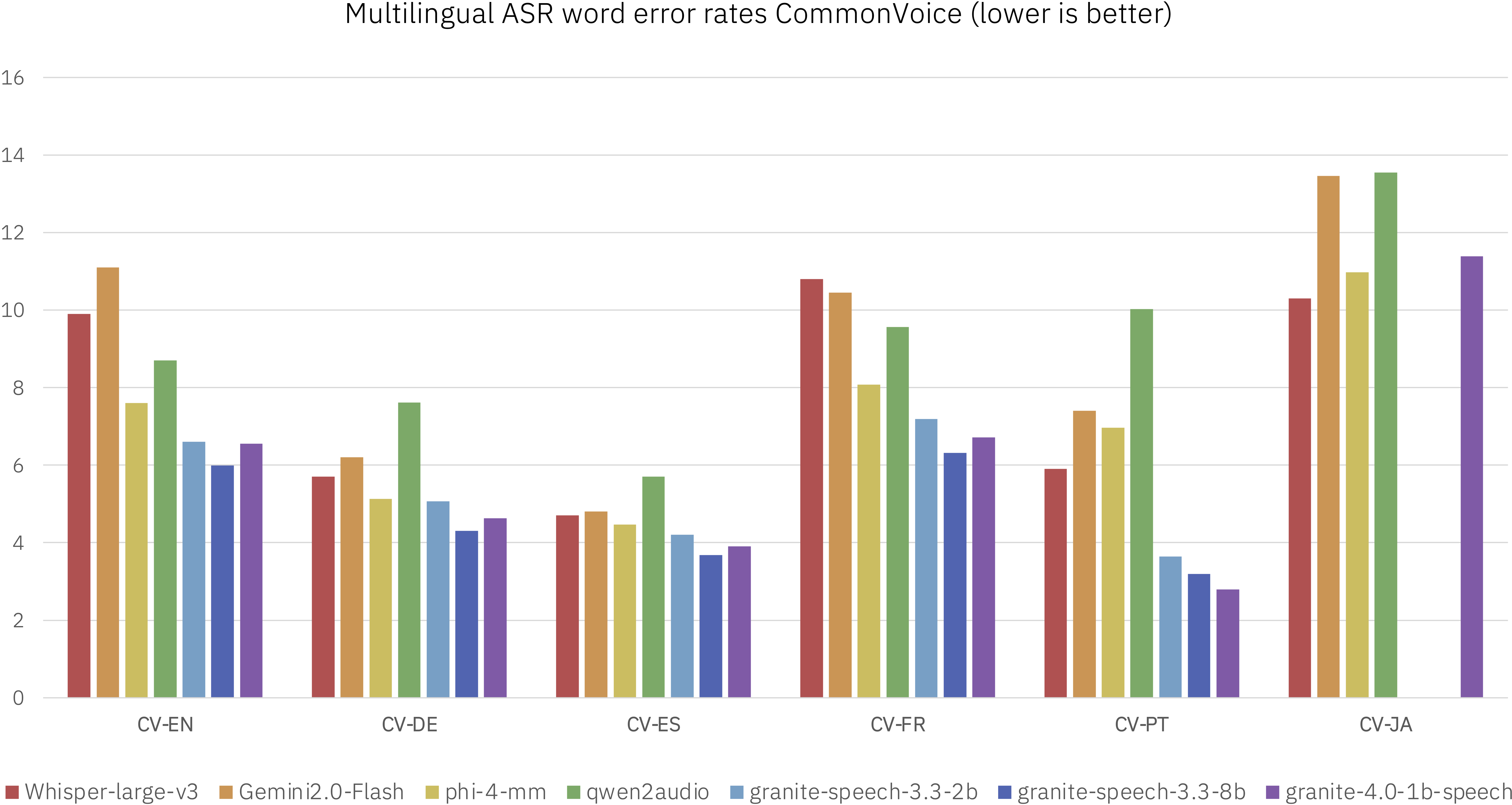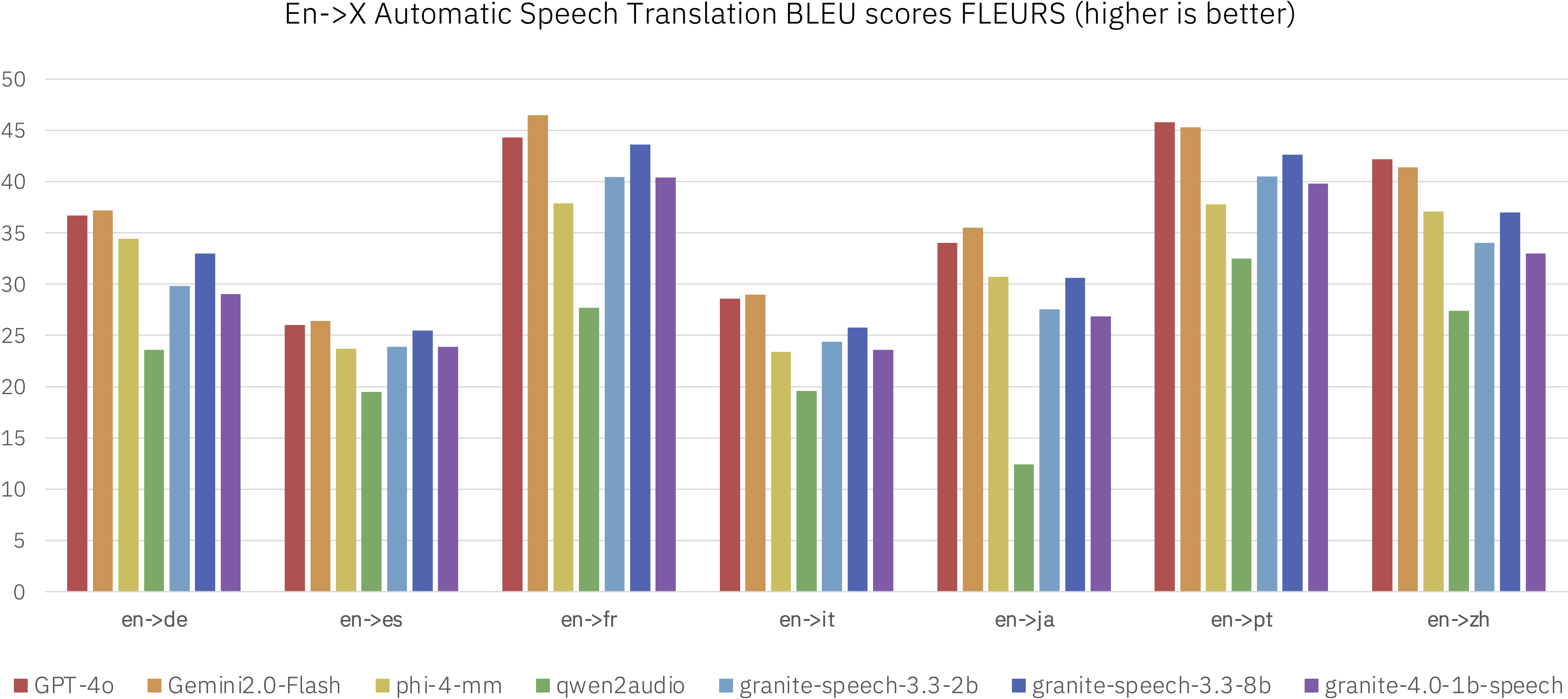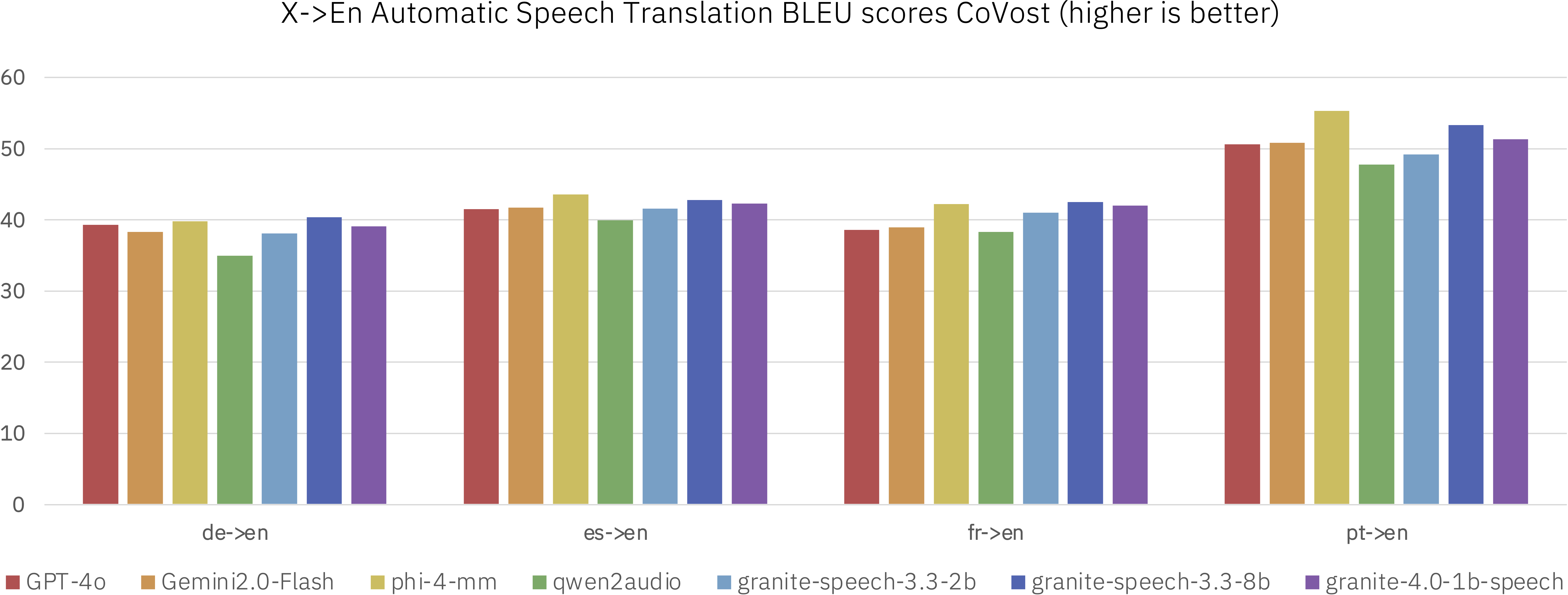 We evaluated granite-4.0-1b-speech alongside other speech-language models in the less than 8b parameter range as well as dedicated ASR and AST systems on standard benchmarks. The evaluation spanned multiple public benchmarks, with particular emphasis on English ASR tasks while also including multilingual ASR and AST for X-En and En-X translations.